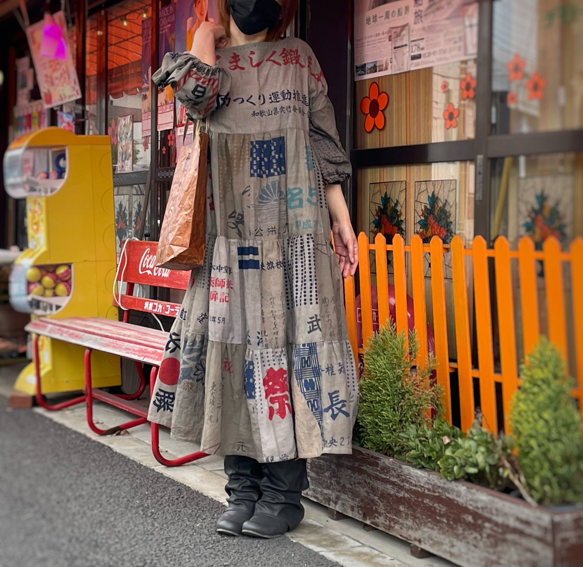 柿渋染めの後に鉄媒染でグレーに染めたたくさんの手ぬぐいを細く切って柄のバランスにこだわりながらパッチワークしたティアードワンピースです。