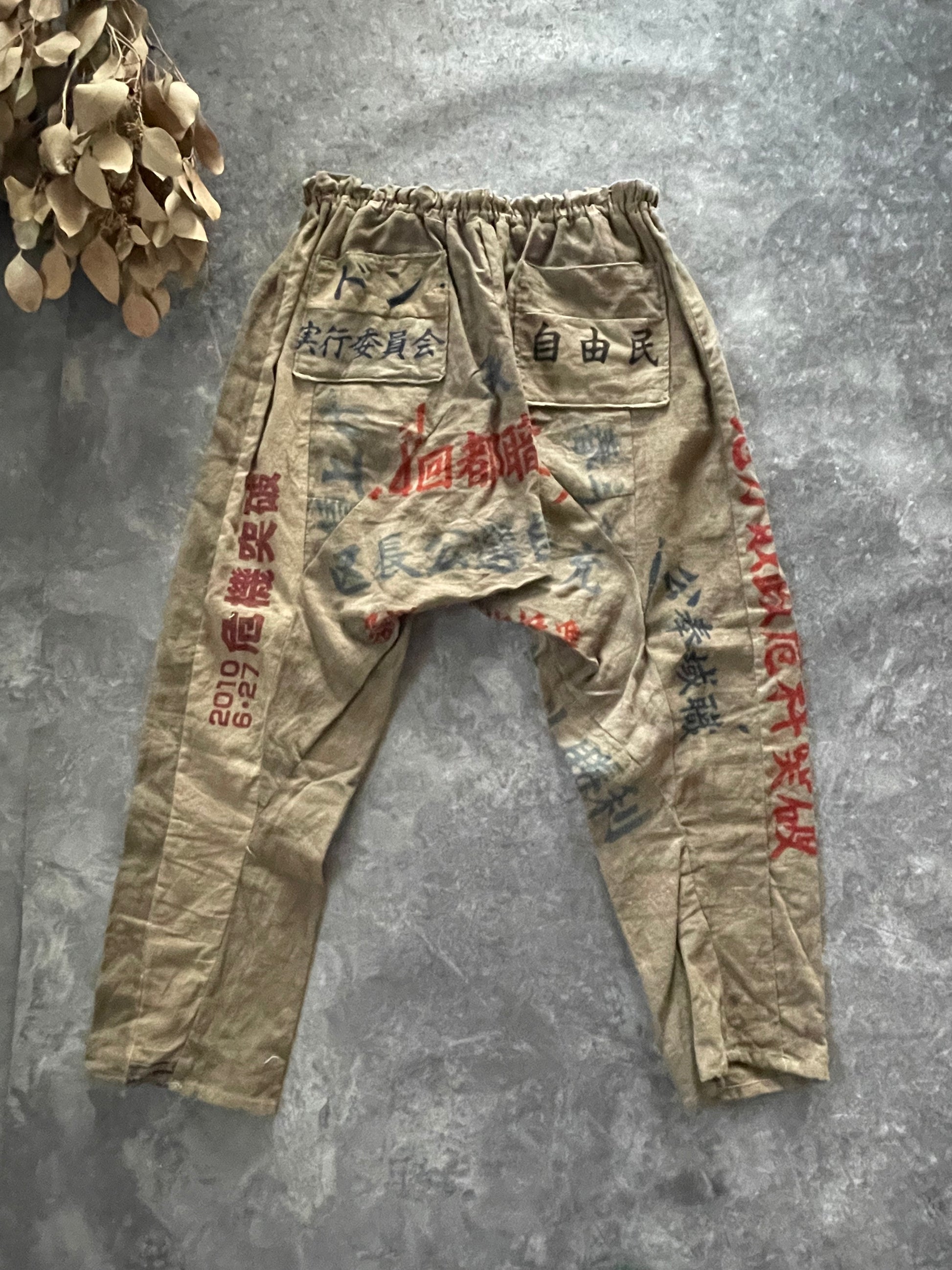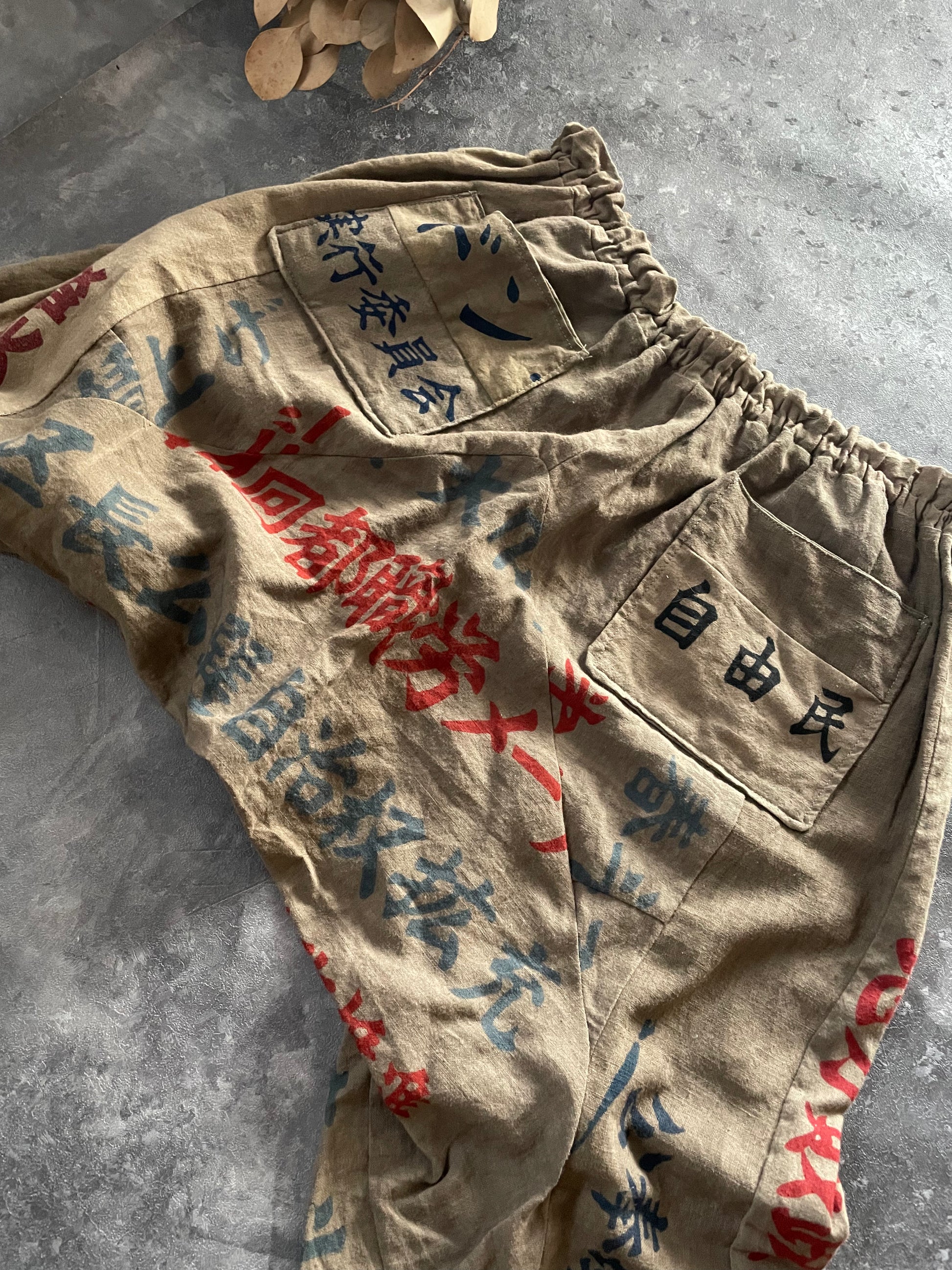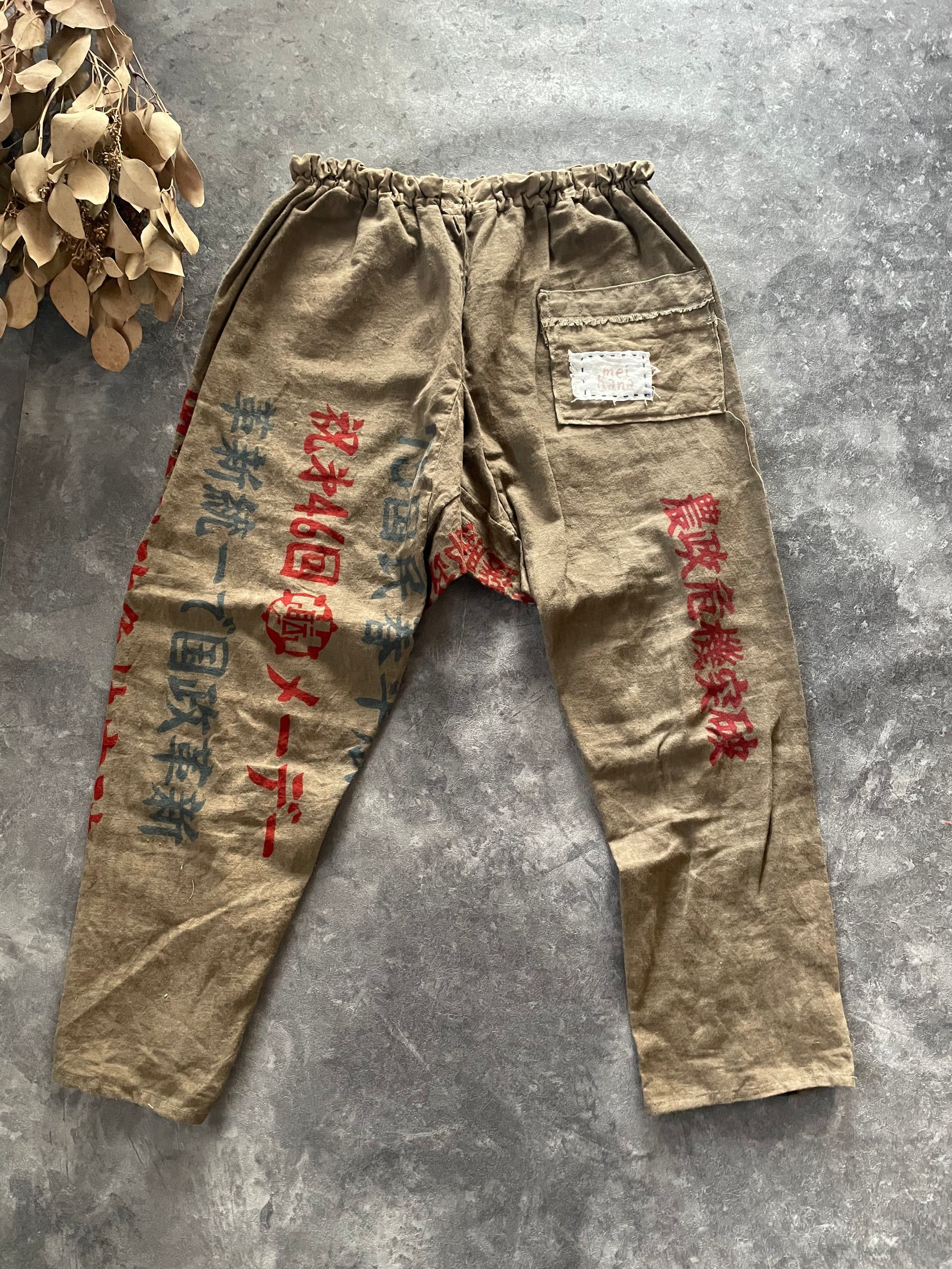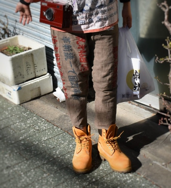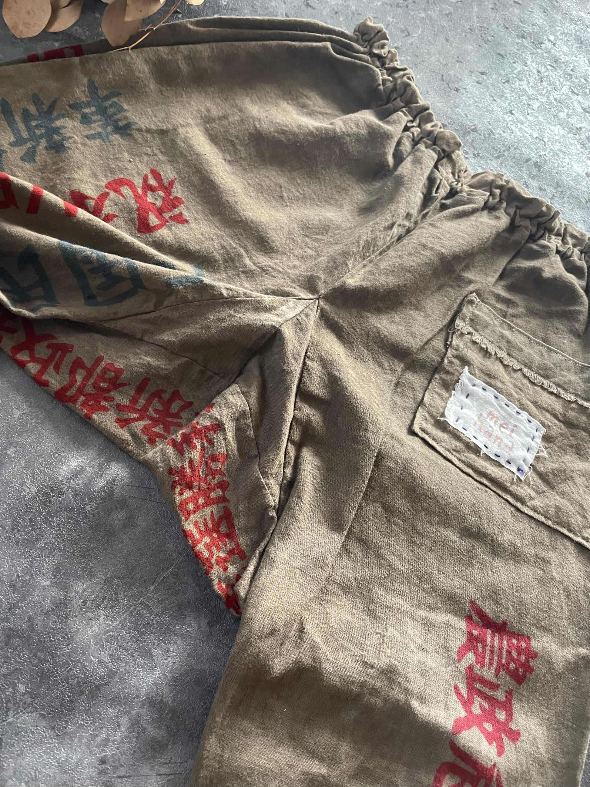 柿渋染めの後に鉄媒染でグレーに染めた手ぬぐいをパッチワークして古くから作られているもんぺのような猿袴のデザインを参考にした細身のパンツを作りました。