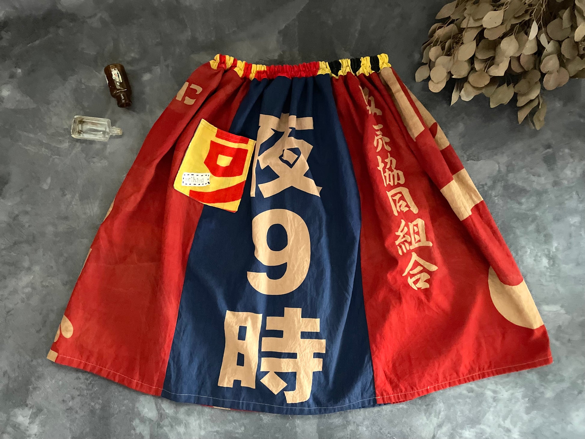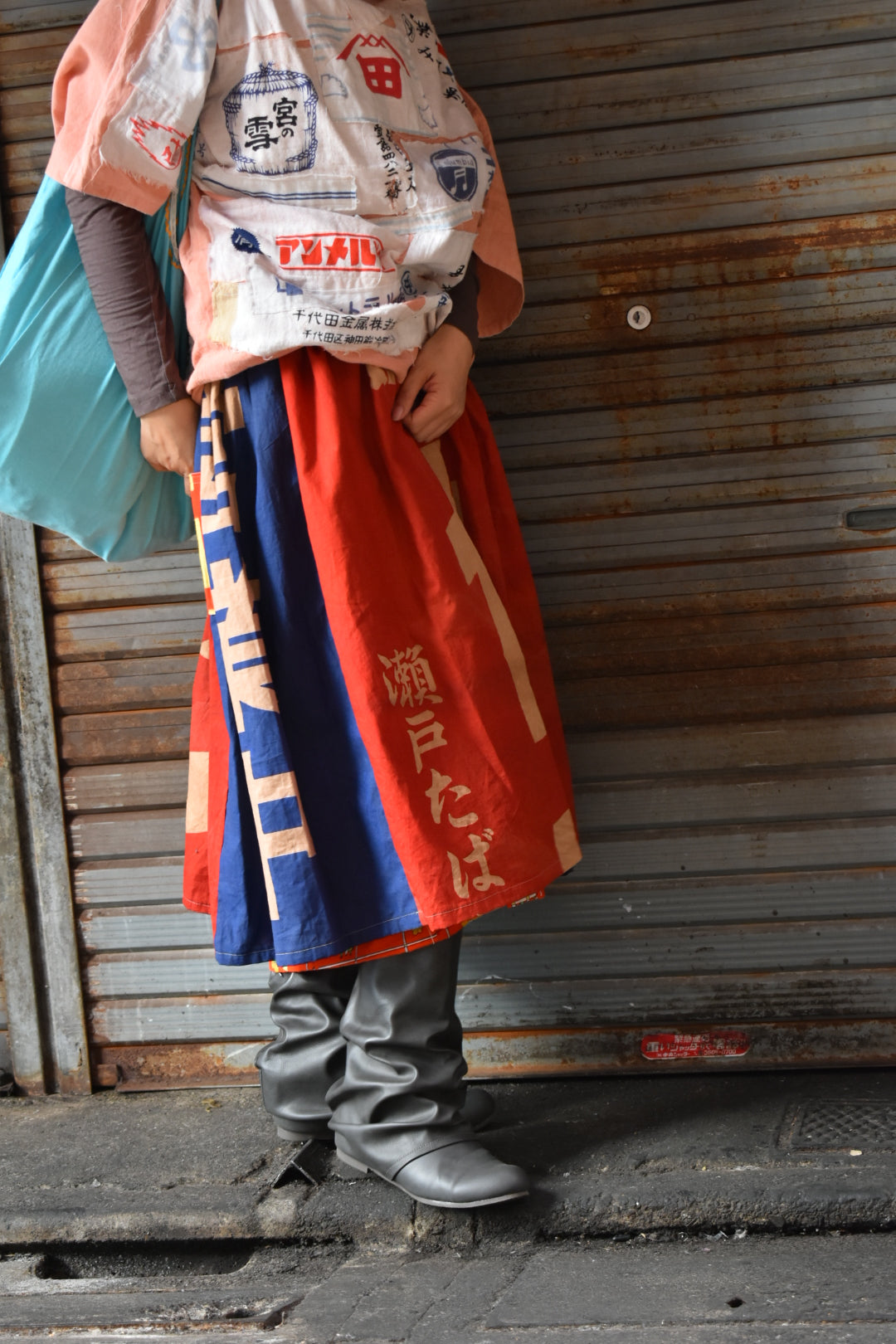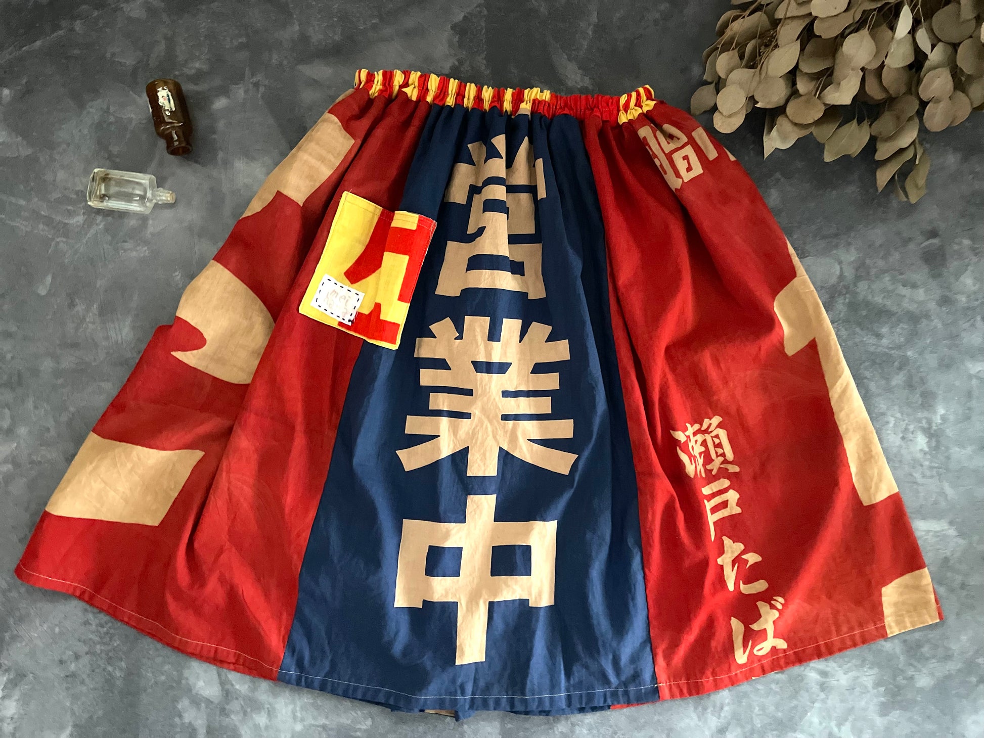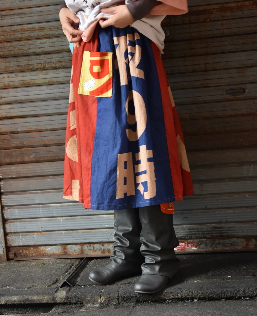 昭和レトロな広告旗を柿渋で染めてスカートを作りました。