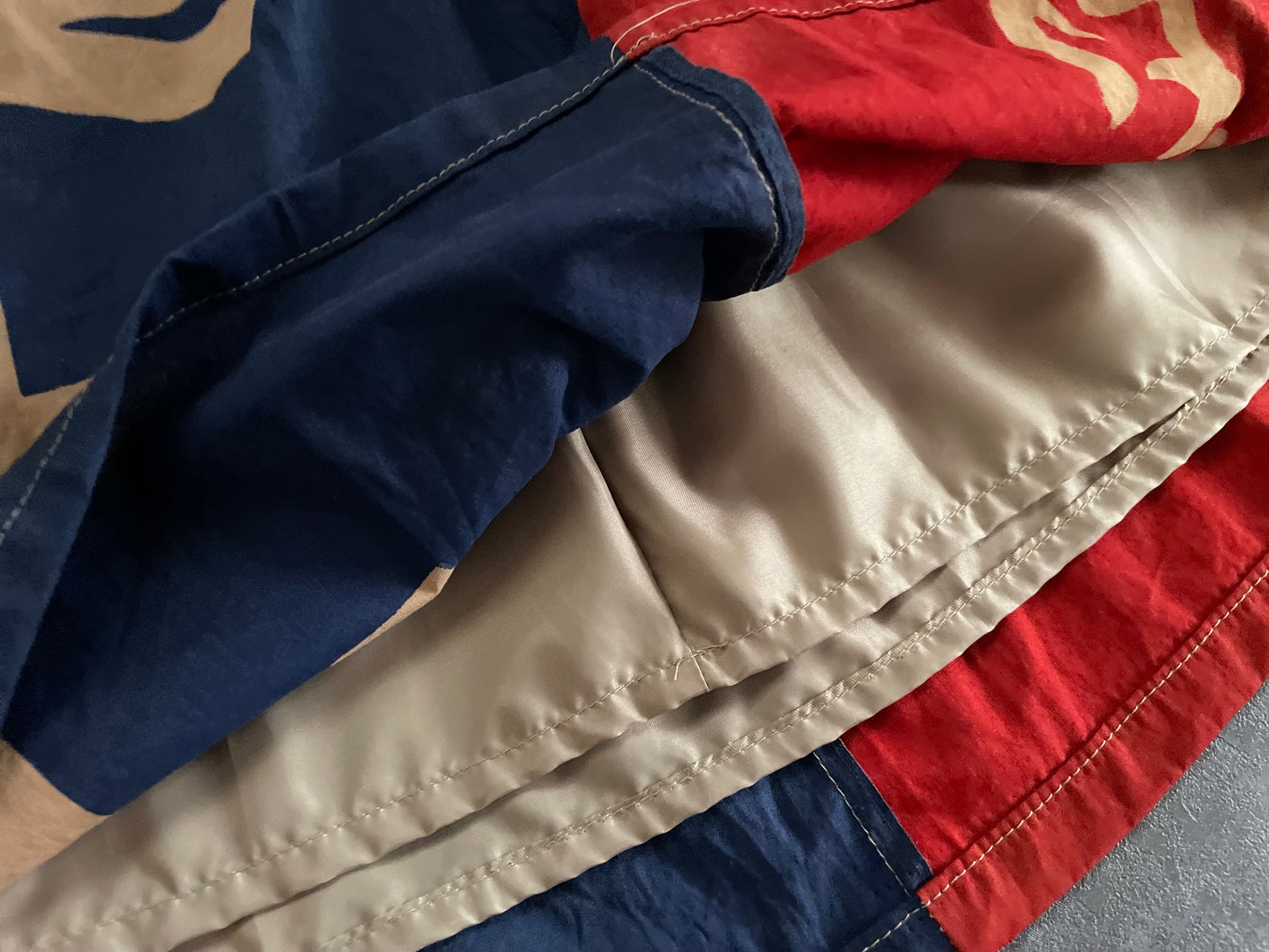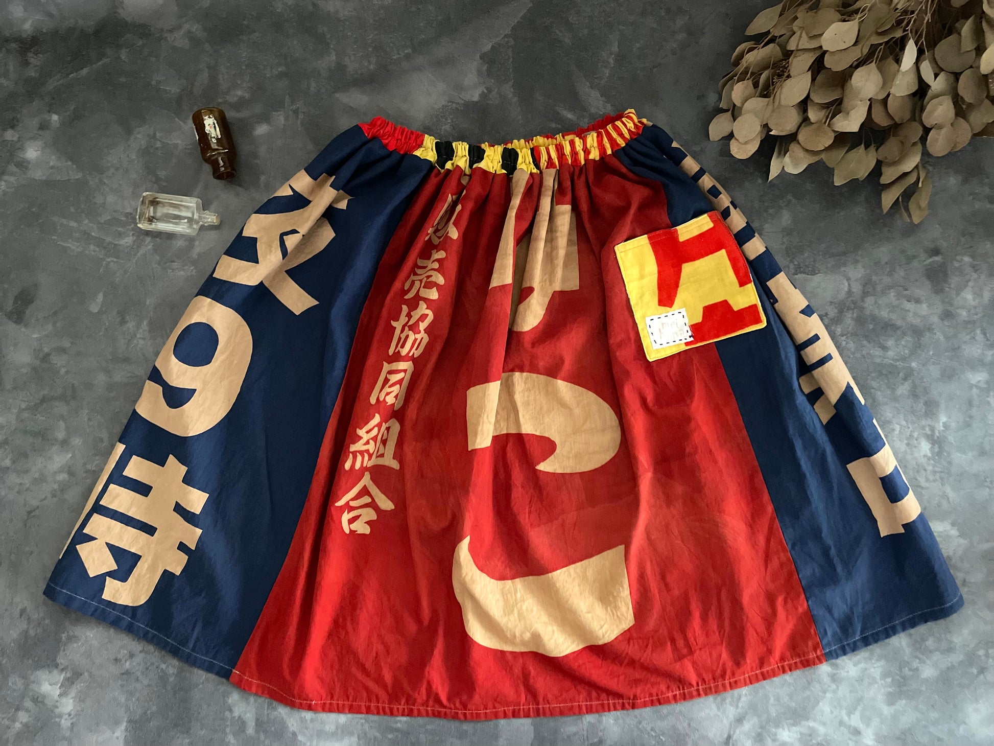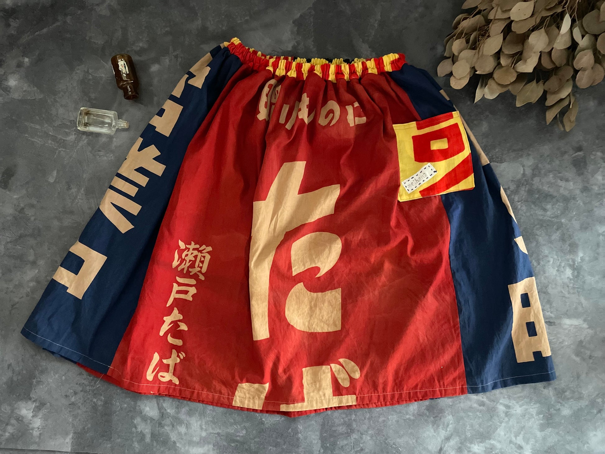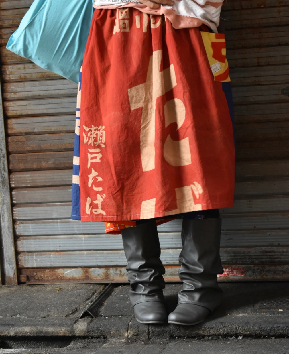 昭和レトロな広告旗を柿渋で染めてスカートを作りました。