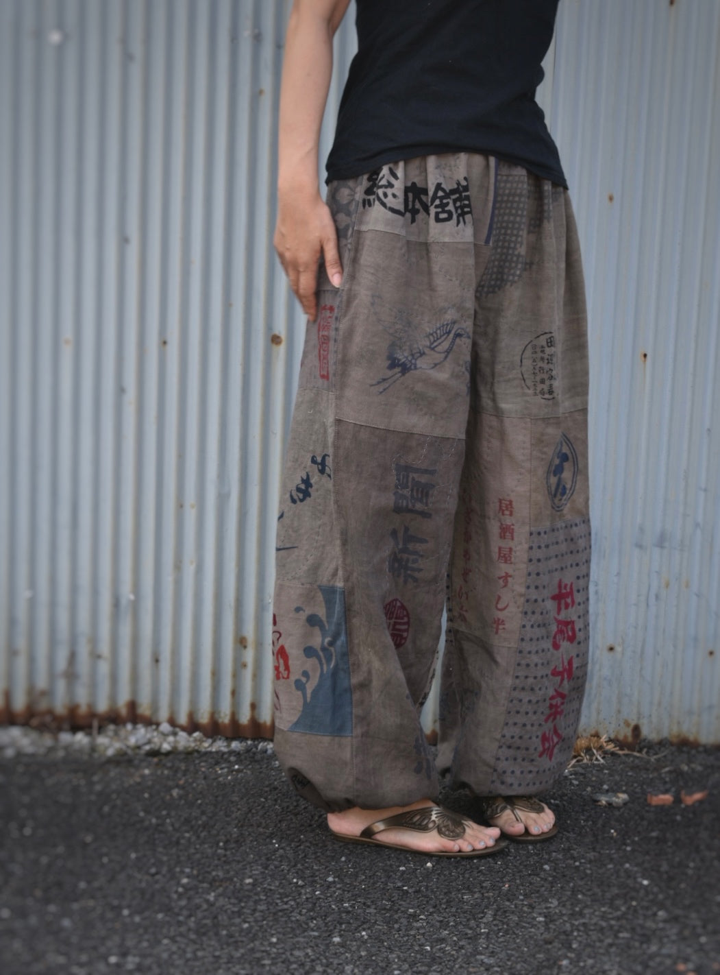 柿渋で染めた後に鉄媒染で仕上げたてぬぐいをたくさんパッチワークしたパンツです。