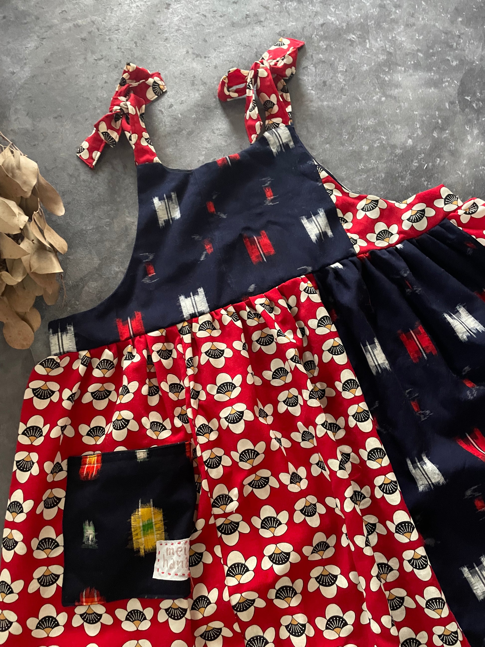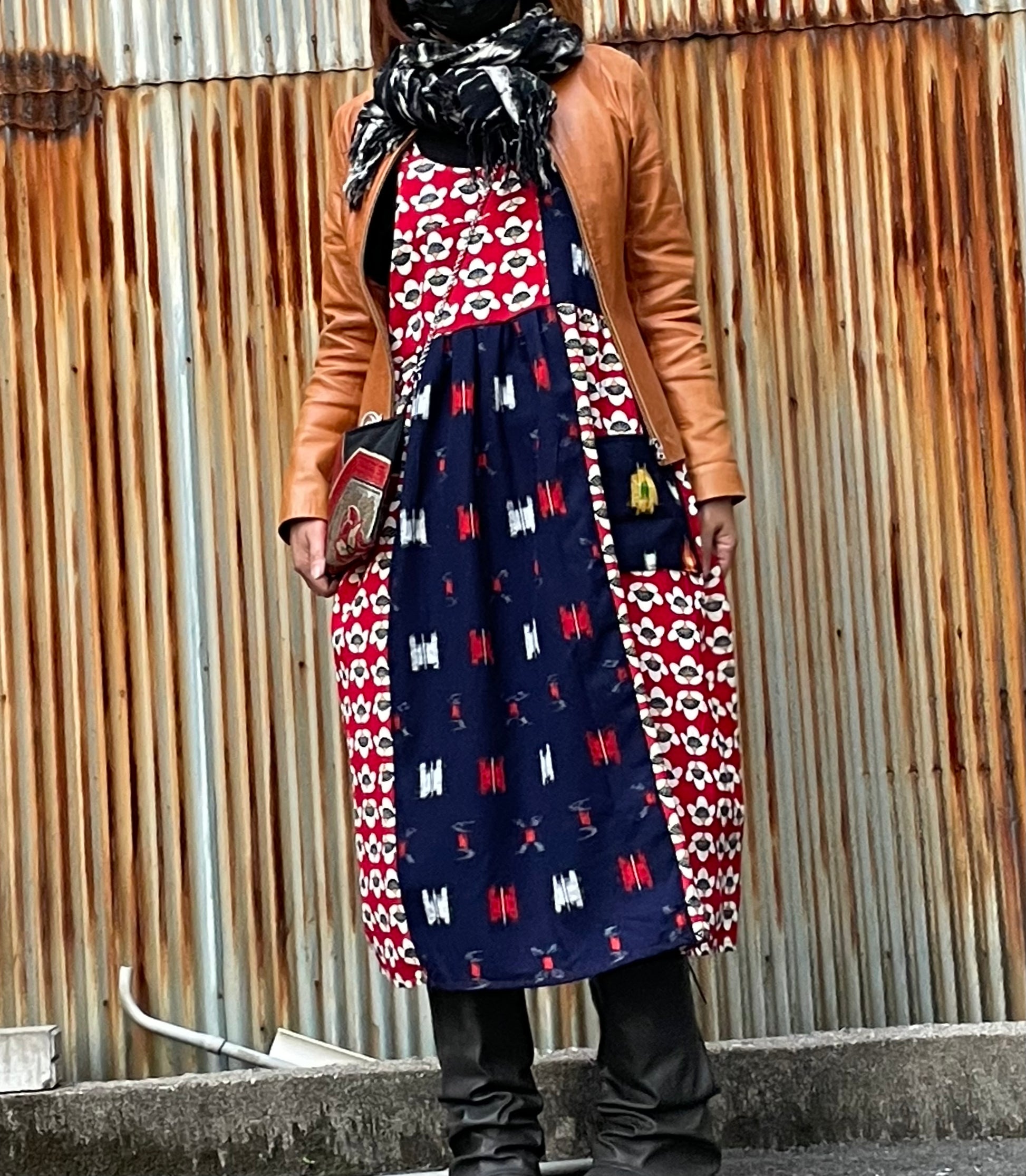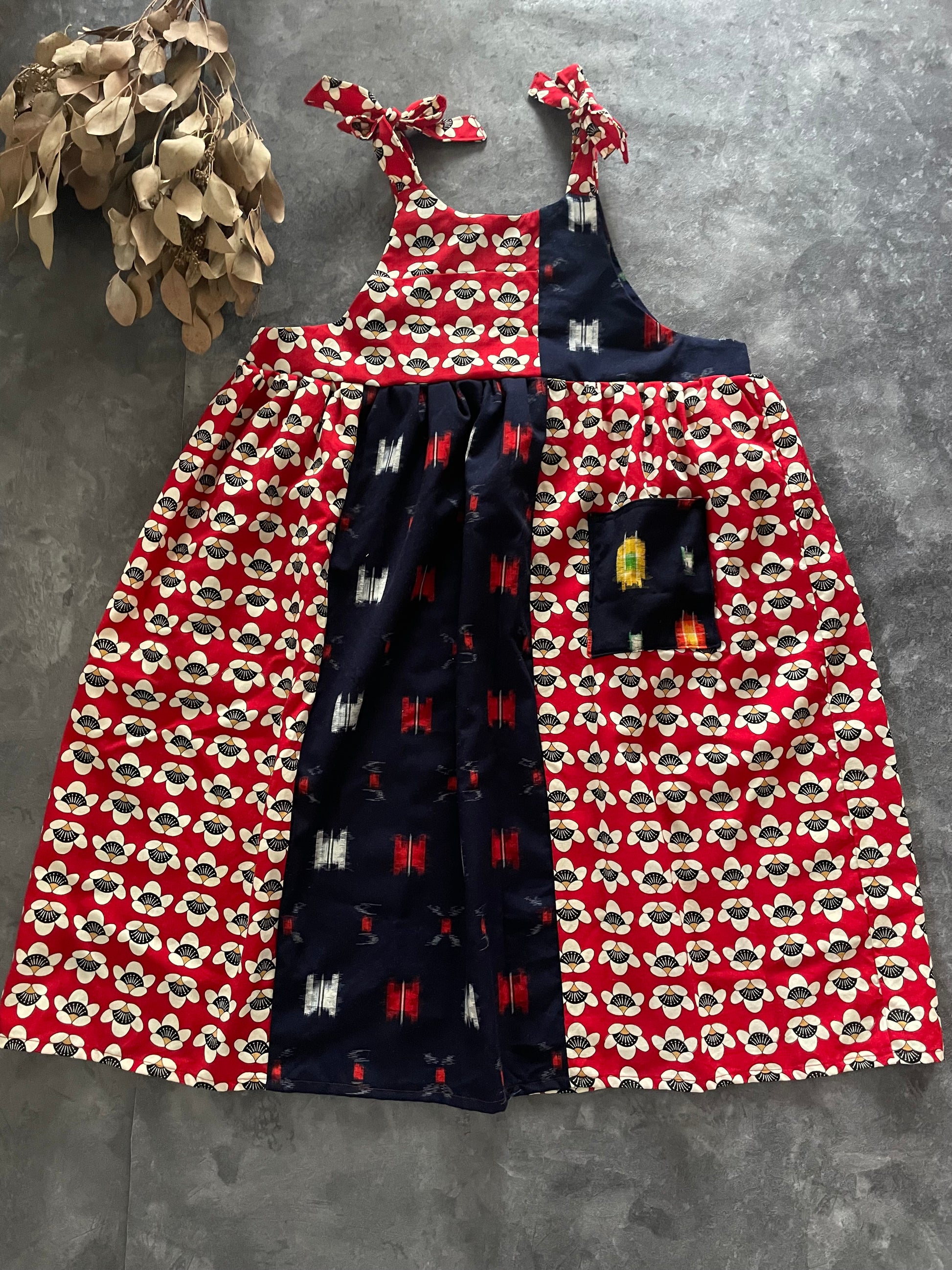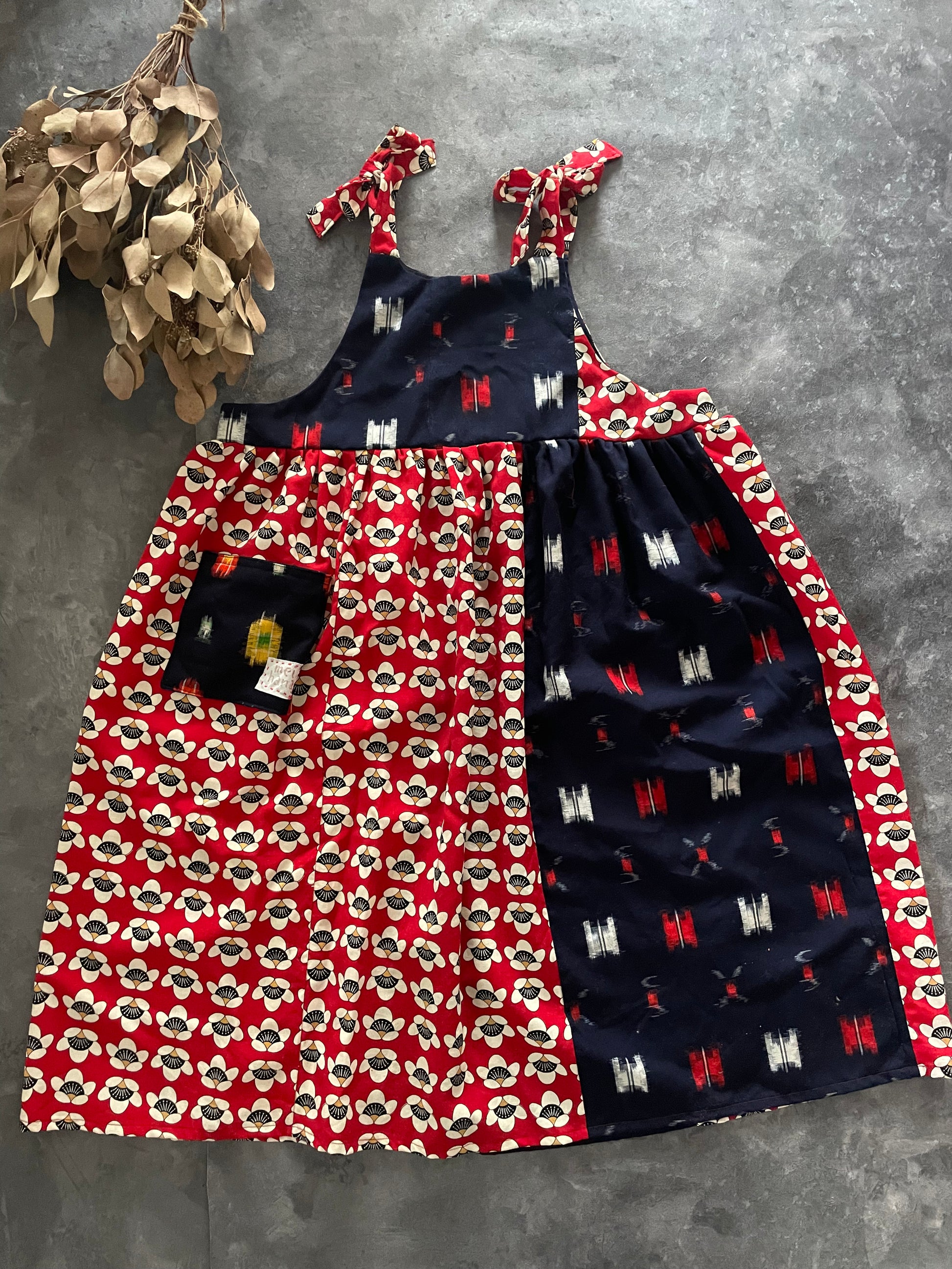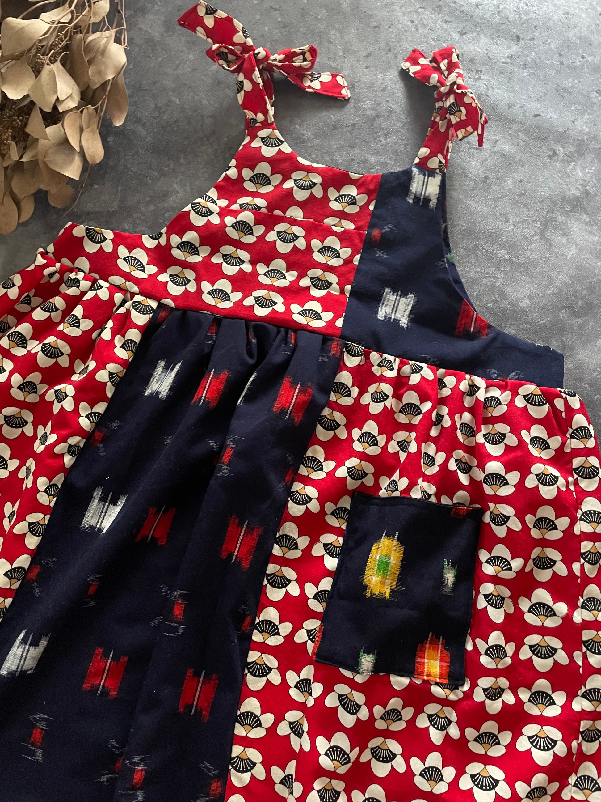 華やかな赤の着物と引き締まる紺色の着物を組み合わせたサロペットワンピース。