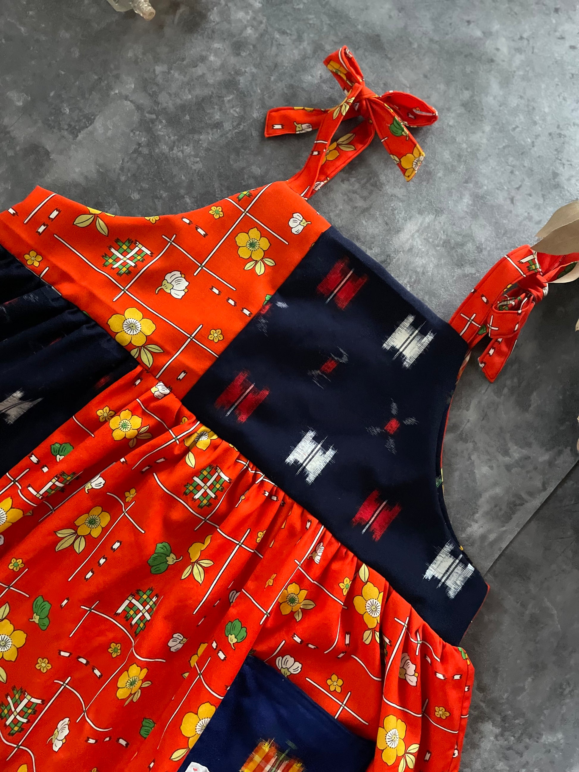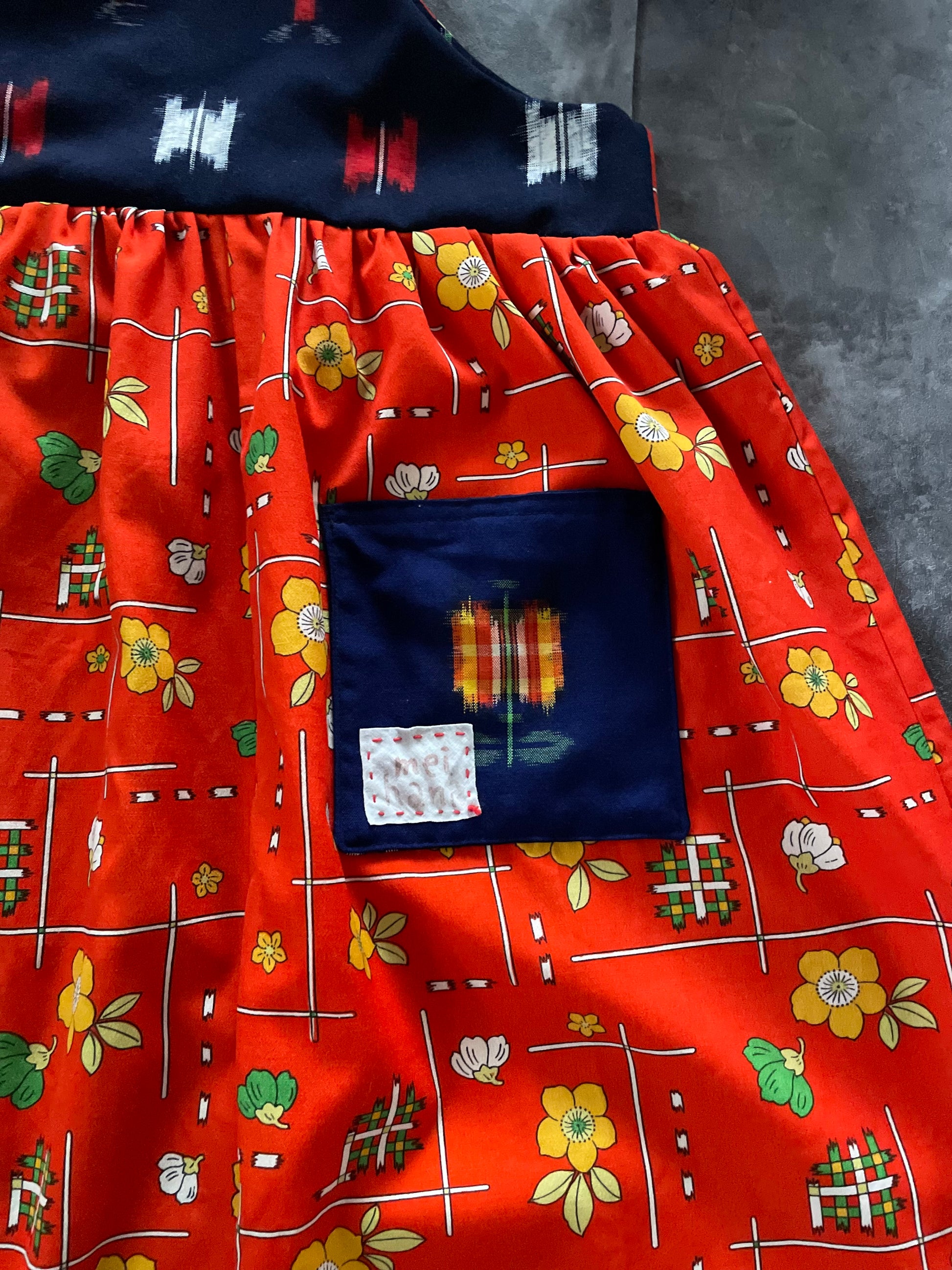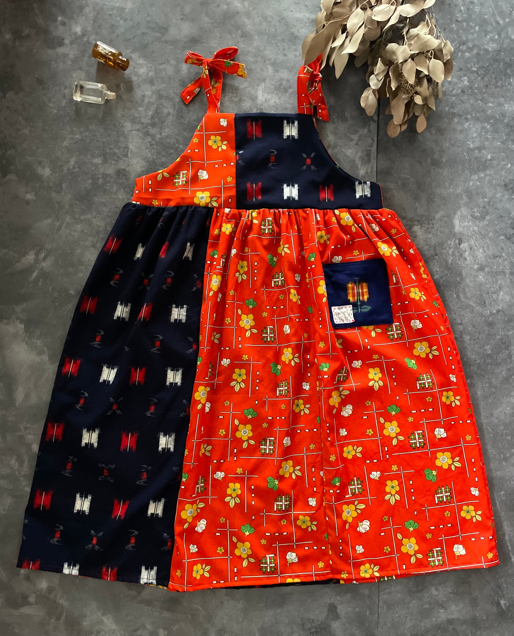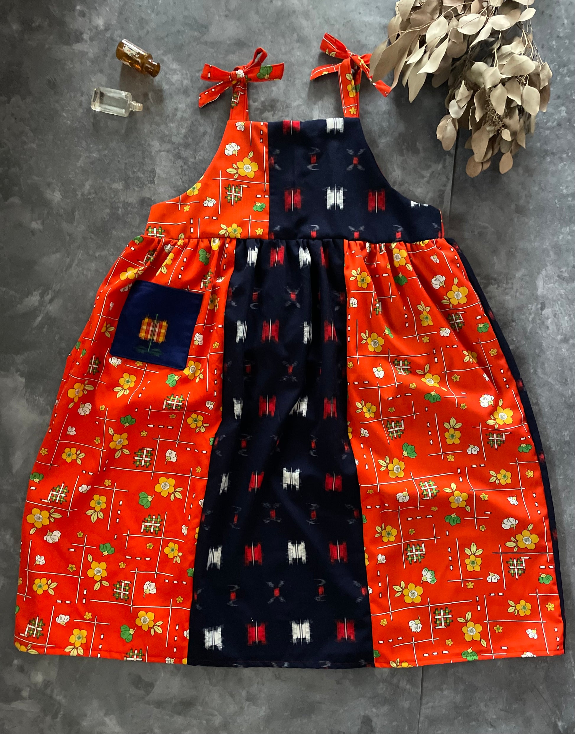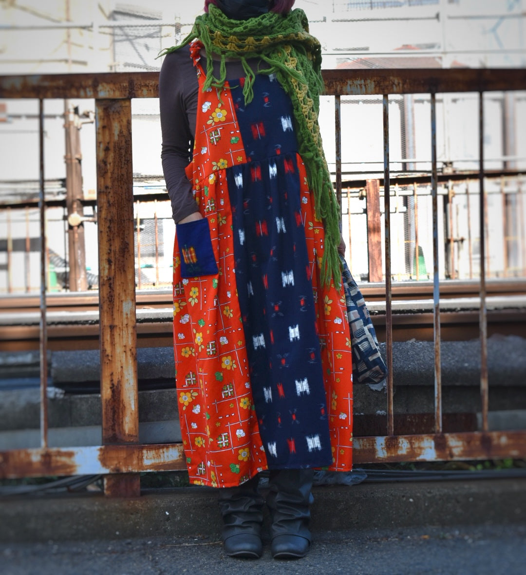 レトロ柄がかわいい着物と引き締まる紺色の着物を組み合わせたサロペットワンピース。
